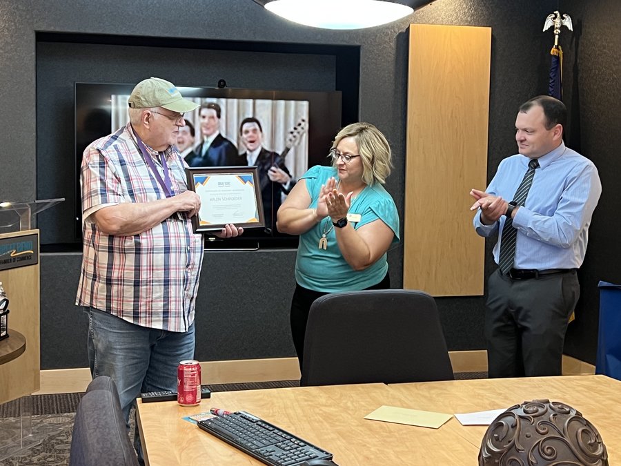 Chamber board members, staff and friends orchestrated a surprise birthday and celebration event in honor of Arlen Schroeder’s impressive 2,000 hours of volunteer service with the Great Bend Chamber. During this event, Chamber Board Chair Shelly Peacock and Vice Chair Rob Bauer presented Schroeder with a plaque, designating him an honorary Chamber member for his unwavering dedication and hard work.