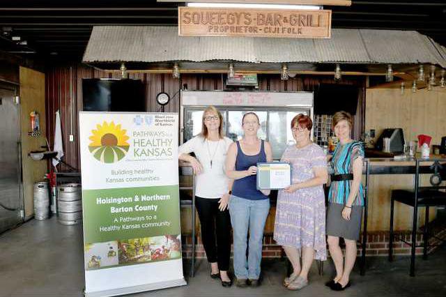 Squeegy’s Bar & Grill recently moved from Main Street in Claflin to a new location on Front Street (K-4). With the new location came a revised menu and an opportunity with the Blue Cross Blue Shield of Kansas Pathways to a Healthy Kansas grant initiative. Working with Karla Crissman from the Clara Barton Hospital Health for Life Coalition, Ciji made several new additions to the menu, and rearranged the menu so those additions were easy for her diners to find. Ciji Folk said she was excited to learn from Blue Cross Blue Shield of Kansas that her grant application had been accepted and approved.
