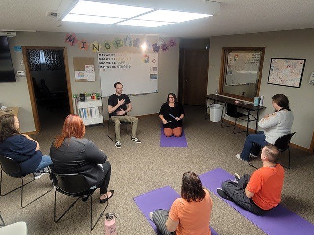 There are 21 case managers in The Center’s Community Based Services Department, serving ages 3-21. The support staff and aides also have become involved in Mindfulness Yoga.