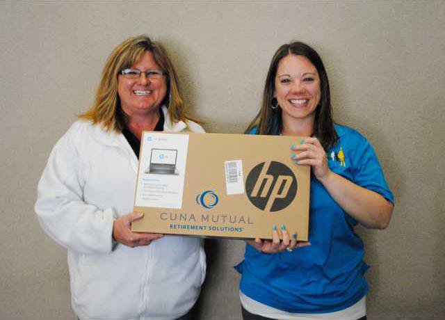 Wendy Hughes of Ellinwood accepts a laptop computer from Candice Moeder with CUNA Mutual Retirement Solutions following the conclusion of Job Fest on Thursday, May 1. The eighth annual Job Fest event attracted over 150 job seekers to the Best Western Courtyard in Great Bend to network with the 27 exhibitors from a seven-county area in central Kansas.