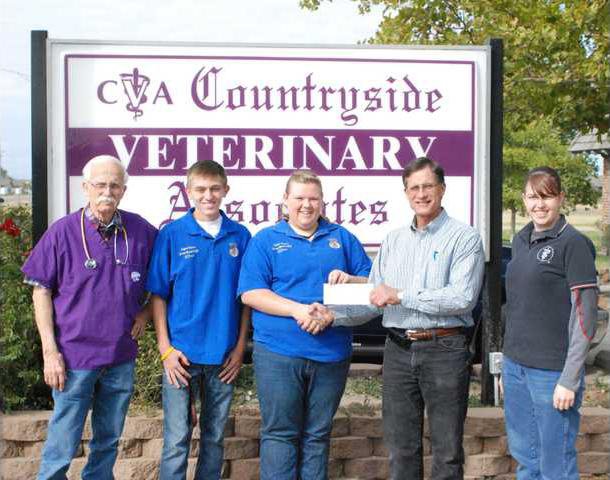 COURTESY PHOTO Pictured is the presentation of a donation from Pfizer Animal Health and Countryside Veterinary Clinic (Great Bend) as part of Pfizer Animal Health support to local FFA Chapters. As of today Pfizer has donated over $4.2 million nationally. This donation helps to support FFA programs who are educating our future Agricultural Leaders. Shown are, from left to right, Dr. Jerry Schrader, Logan Evers, Kelsi Wertz, Dr. Bill Niederee and Dr. Sandi Hayek.