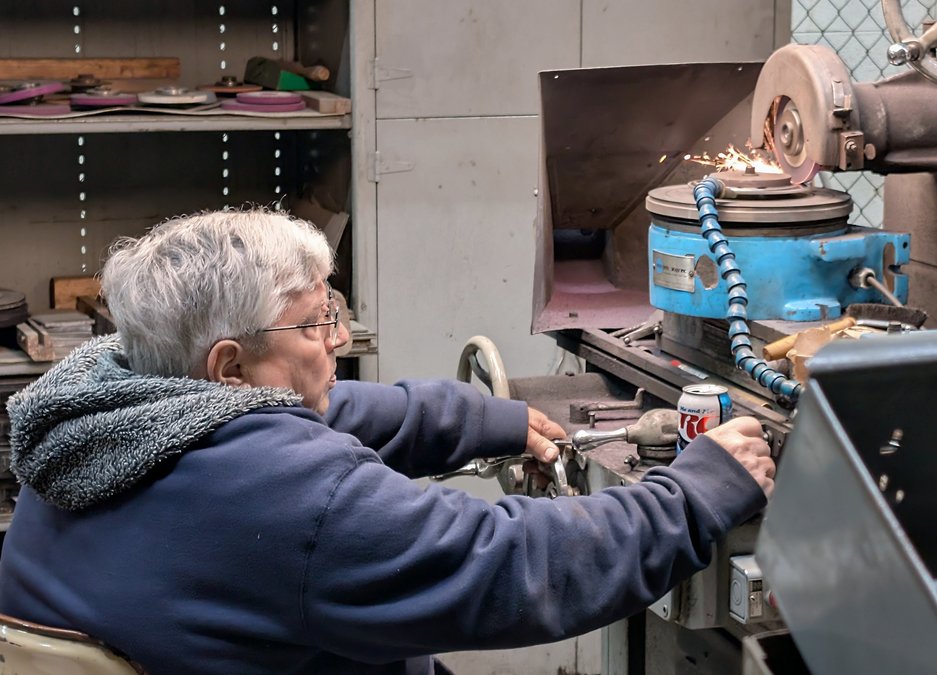 Steve Oberle, a long-time Fuller Industries employee who has served the company in both full- and part-time capacities, demonstrates the meticulous nature of manufacturing work as he manages the manual adjustments of a grinder to finish a brush-cutting blade for a client in the recreational industry.