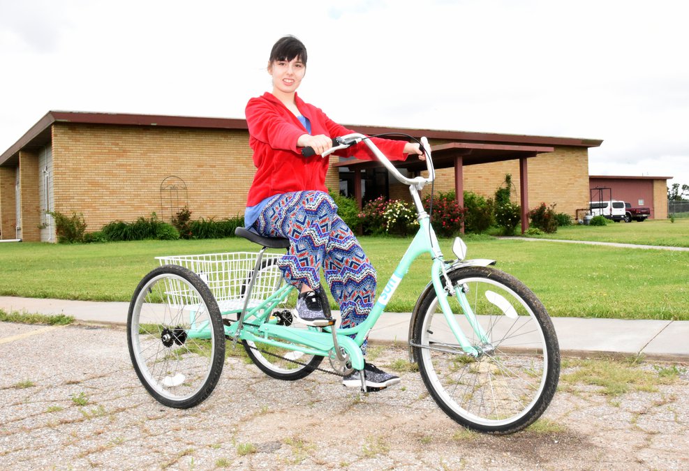The project began several months earlier with a request from Anita De Tello, mother of Italia, to Schmitt. Other needs had already been addressed for Italia in previous person center planning meetings, but Italia still needed the specialized tricycle that provides balance and coordination when she rides. The new mint-green trike with white wall wheels was finally purchased from Golden Belt Bicycle Shop in Great Bend and delivered to her.
