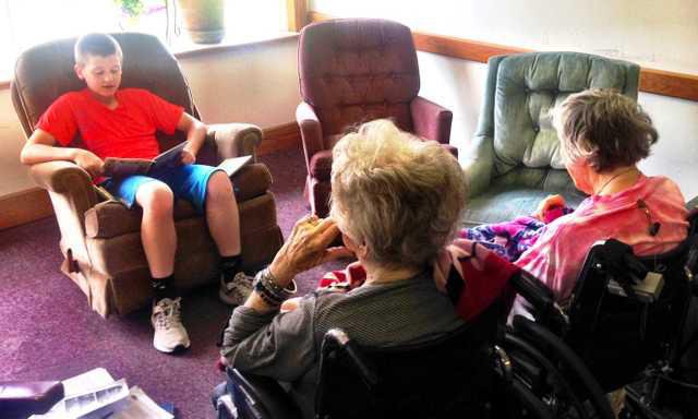 Since early this summer Tyler, 12, has been reading to residents in the long-term-care facility’s memory unit three times a week. He also shares with other residents by coloring and playing games with them.