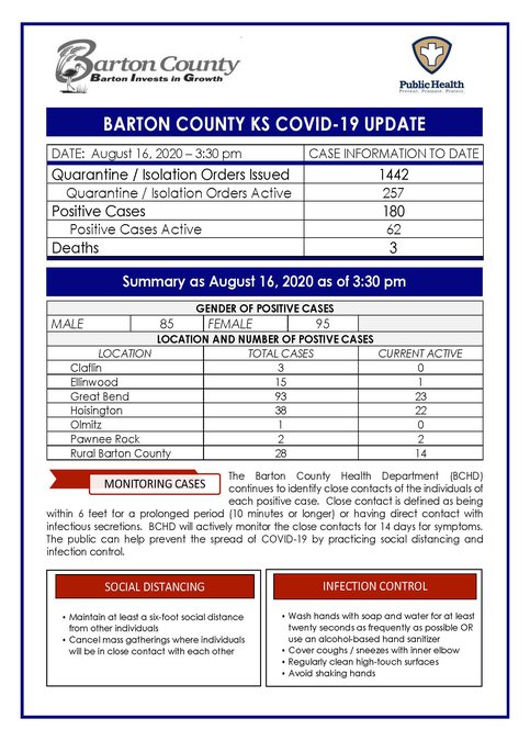 Sunday’s cases were three males and one female. Three reside in Great Bend and one resides in Hoisington.