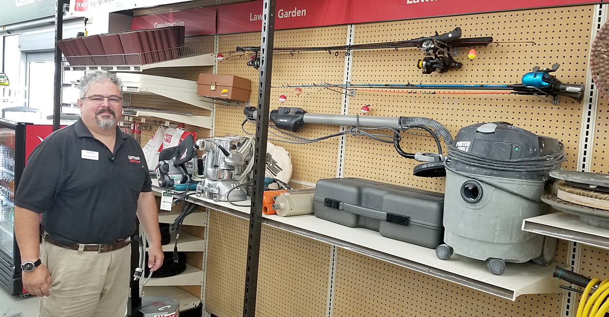 Jacque Scheideman, the widow of Ray Scheideman, donated her late husbands seven rod and reels to the Rotary Club Youth Fishing program. The equipment is at Waters True Value Hardware store and is available for any adult that would like to take a young person fishing or for any young person to borrow free of charge, all one has to do is provide their own bait. The poles are located in the rental department. Mike Mayhill, manager of the Waters Hardware Store, shows off the fishing poles that are available.