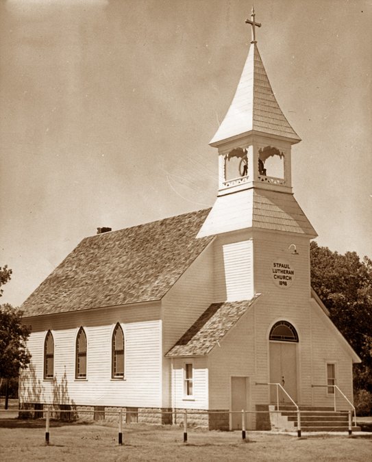 St. Paul Lutheran Church was located southeast of Albert, on land donated by Julius Both, grandfather of Alberta Wright. Construction for the 28x40 foot church began in October 1898 by John A. Mausolf and John Evers. The 45-foot steeple was a signal to those in the area that a church was located there. Limestone for the foundation was quarried in Rush County, nearby. The tongue and groove wainscot ceiling was installed prior to the installation of the steep pitch roof because it had to be finished from the outside.