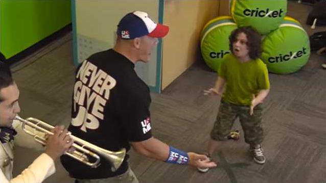 Cricket Wireless invited some Cena fans to one of their stores to "audition" for an opportunity to introduce the wrestling icon. What they didn't know is Cena heard every word they said and was waiting to burst through a poster and surprise them.
