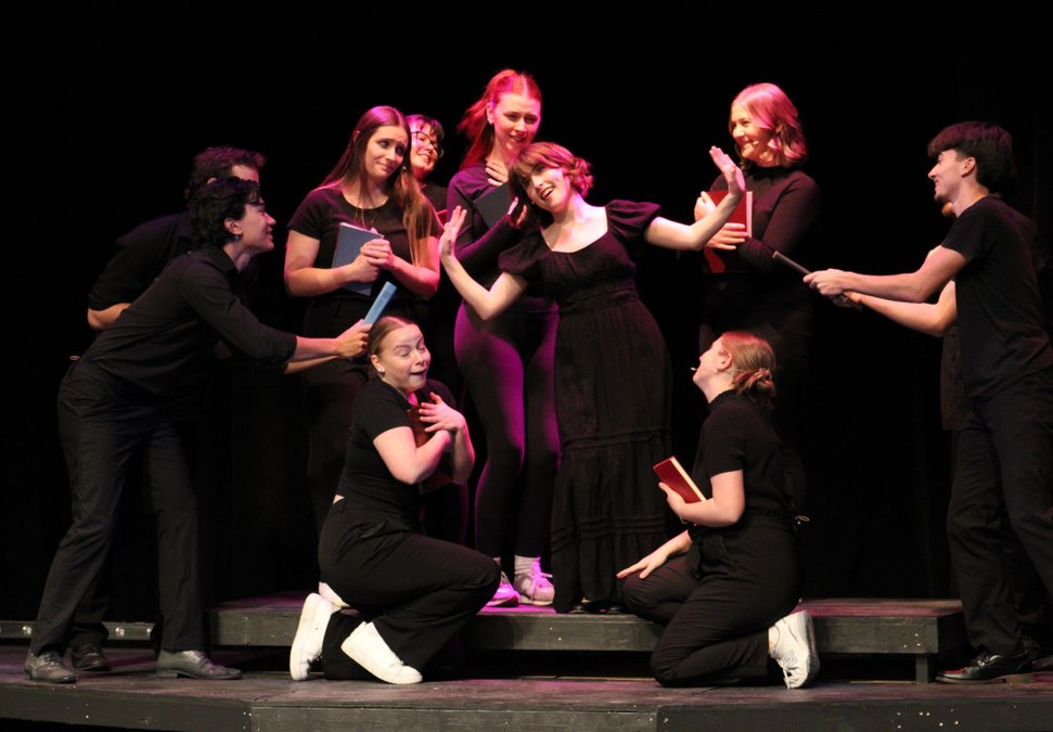 Pictured is a moment from the song “What Is This Feeling” from the musical “Wicked.” Mary Little (center) leads the ensemble as Galinda.
