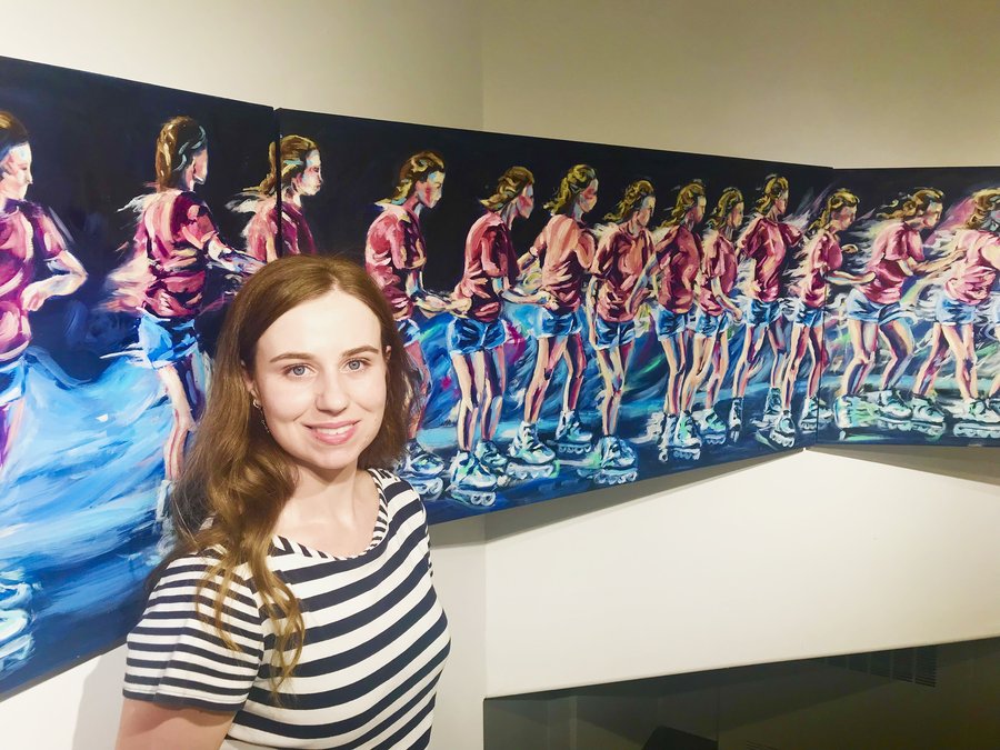 She started the artwork by creating paintings from video frames. “Many of these paintings in ‘Centripetal’ were from exercises or activities I enjoy doing. Everything came together when I realized how many activities I did because I was trying to relieve pain in my shoulder and back from scoliosis.”