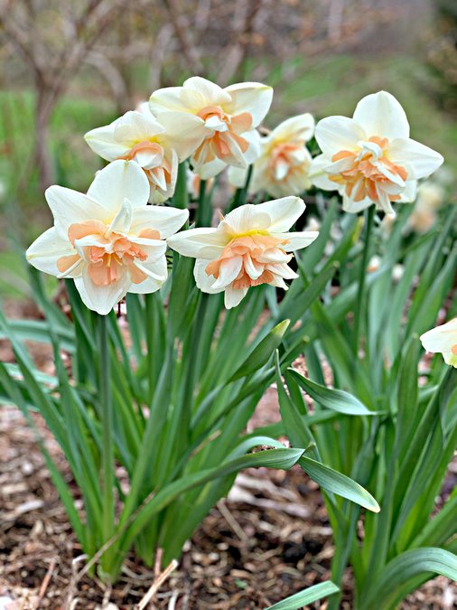 Close out the season with double daffodils. Their fluffy flowers resemble roses, and most varieties are fragrant. Delnashaugh (longfield-gardens.com) is one of the most impressive doubles. Its enormous, 4” flowers feature layers of frilly white and peach-pink petals. Tahiti is just as large, with soft yellow petals and red-orange ruffles.
