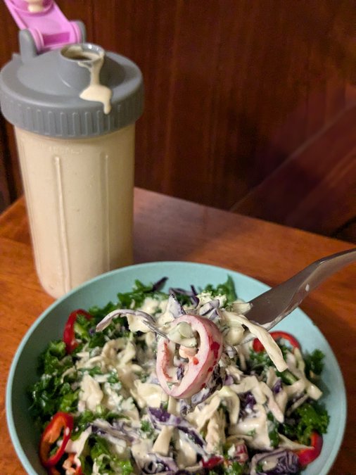 There are so many honey-focused recipes we do that I could share for this H is for Honey article, and I was stuck between this and a hot honey chile butter I also just made. But that one was too easy (you can see the ingredients in the name…) and this dressing is an awesome addition to autumn salads. It’s thick, creamy, sweet but not too sweet, and pairs beautifully with all the fall things like butternut squash, apples, kale, etc, although it’s also getting used around here as a dunk for our cherry tomatoes that are finally ripening.
