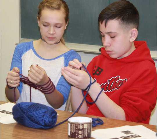 Alexa Straub, 15, is an expert in the art of arm knitting. She should be, after doing it for six years. Thursday morning, she patiently assisted other youths attending Fiber Arts Fun Day in the process of first looping bulky yarn around one arm, known as “casting on,” and then holding onto the tail of the yarn and looping it through on one side and transferring the new loop onto the other arm to make a stitch. Instead of using knitting needles, the young people learned to use their arms as needles as they created loosely knit scarves.