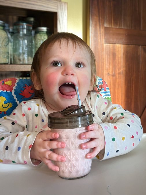 The volume of strawberries consumed (and dripped and dropped and smashed) in our home this week is also impressive. I did not do much stove-top cooking, as there was always someone in my arms or at least wrapped around my legs, but plenty of one-dish meals and salads — and things thrown in a blender. I know my recipe used a blender last week too, but I’m gonna be honest, I use it every day, so it’s hard to stay away. Rosie chugged this nutritious, creamy strawberry milk like a crazy woman, and I drank my glass during her nap so I could enjoy it without being tackled for it.
