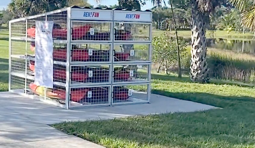 The kiosks are basically cages that store the kayaks, life vests and oars. Users will download an app on their phones they can use to open the compartments to access the equipment, and they will be charged for the rental.