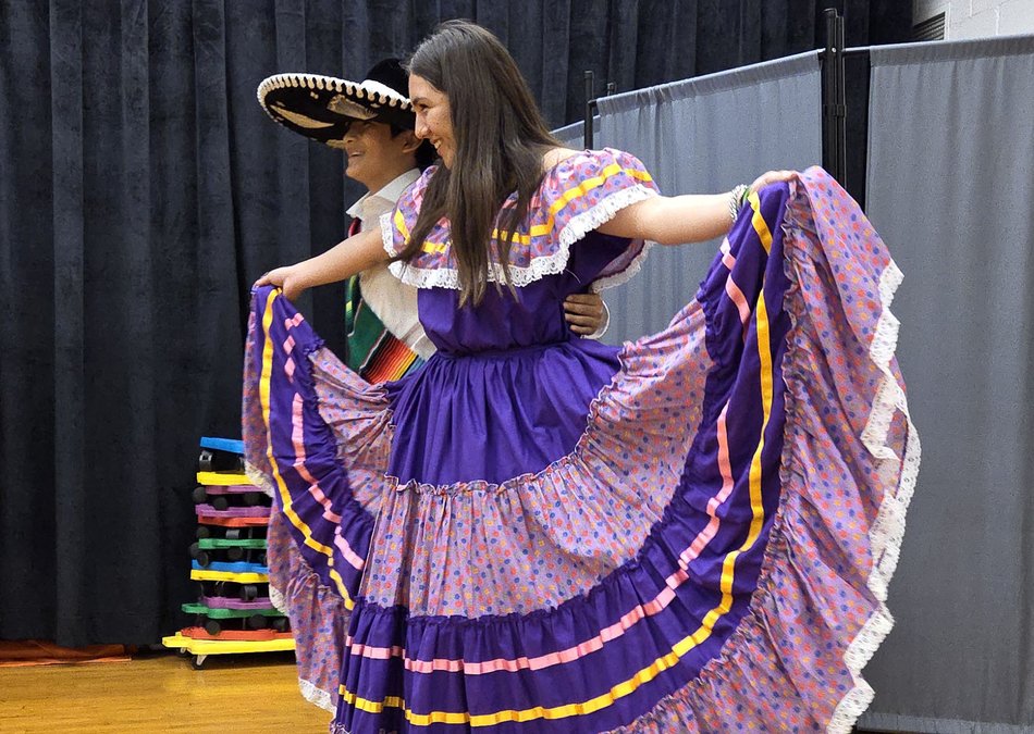 Members of Great Bend High School’s El Sol Latina folk dance group perform for Park Elementary School students Thursday afternoon. They will be performing throughout the day on Saturday during Great Bend’s Cinco de Mayo Celebration, going on downtown from 11 a.m. to 6 p.m.