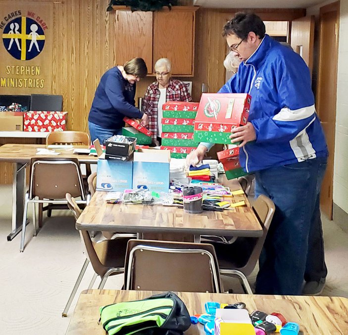 Operation Christmas Child has volunteers fill boxes with gifts for needy children around the world to receive as Christmas presents. First United Methodist Church members started working on the project last September.