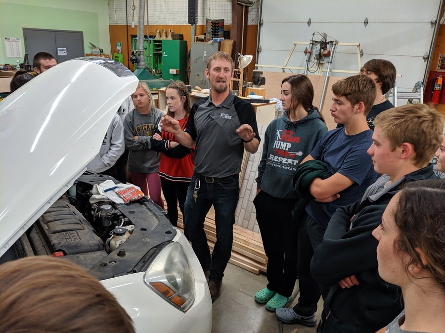 He went on to explain the vehicle needs to be turned off long enough for the oil to settle. After checking the dipstick and determining the oil was low, he asked students how much oil he needed to put in. Guesses ranged from none to three quarts.