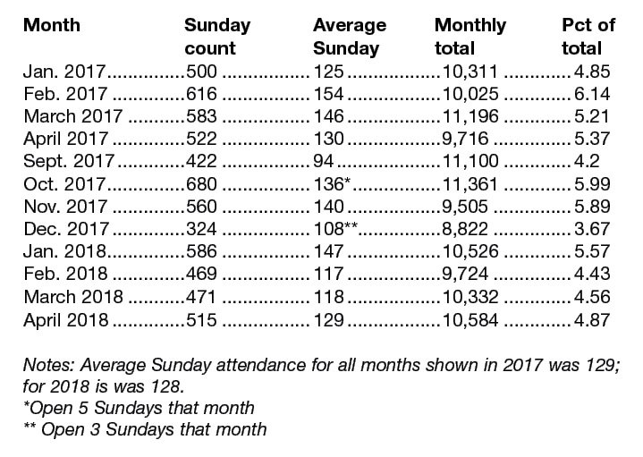 The library board looked at the door count total by month from September 2016, when electric door counters were installed, to August 2018. The average Sunday attendance in 2017, excluding the months of May, June, July and August when the library was on summer hours at least part of the month, was 129 people. The average has been about the same in 2018.