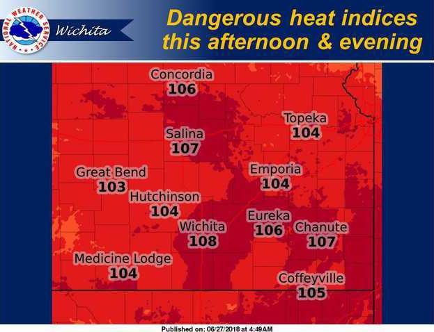 WICHITA -- The National Weather Service in Wichita has issued heat advisories starting Wednesday. Heat indices are expected to approach 110 degrees. Heat indices are expected to climb to between 105 to 107 degrees Wednesday afternoon and early evening, especially for areas along and east of Interstate 135.