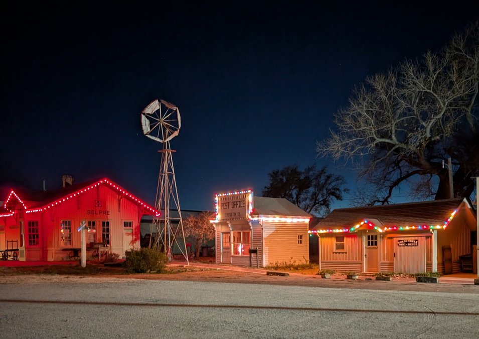 The buildings on the historical society grounds have been decorated with lights and folks are encouraged to drive through the village after dark. If you look closely you might find Santa Claus peering through the post office window. The Lustron house also has an aluminum tree in the living room window that has a rotating color wheel that is lighted at night. Outside lights will be on through the New Year holiday.