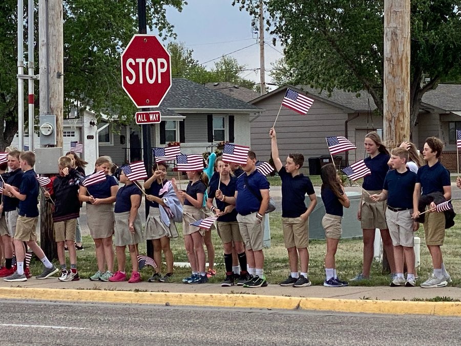 Students from Holy Family School welcomed The Wall That Heals escort as it passed them on McKinley Street, Tuesday afternoon. The escort was also viewed from Riley and Jefferson schools, and Park School students joined the throng on Main Street, watching from the Dillons parking lot.