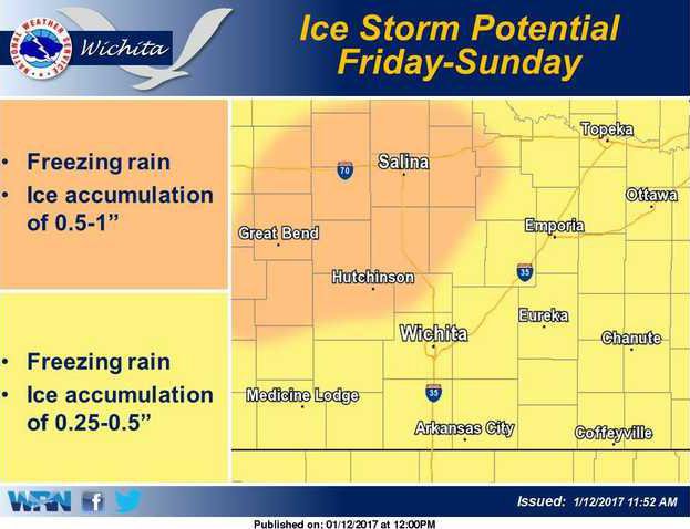 TOPEKA NWS — Light freezing rain is forecast to begin across the east on Friday afternoon and continue overnight into Saturday. Heavier accumulations are expected Saturday night into Sunday morning, when damage to trees and power lines becomes more likely, with significant impacts to travel expected. There is still uncertainty to amounts with this forecast with much of the area very close to the freezing mark.