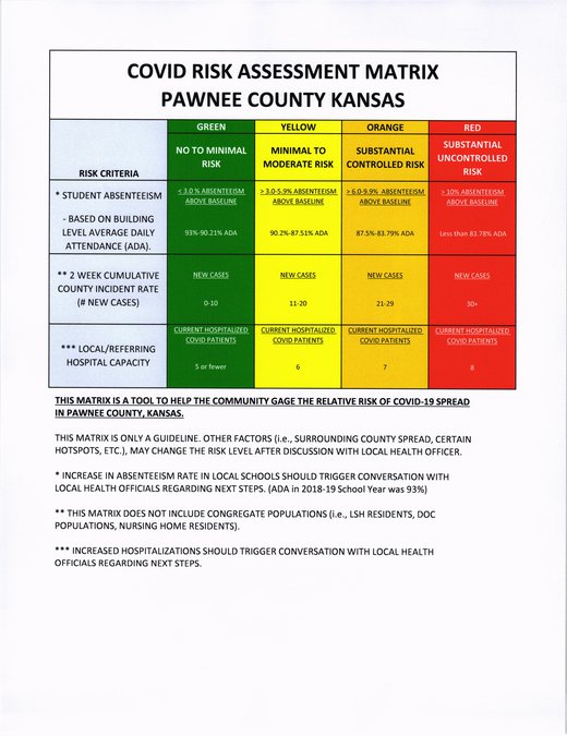 Monday morning, Aug. 16, the Pawnee County Commission approved a public health order that adopted a Risk Assessment Matrix. The commission approved 4 levels of risk — Green, Yellow, Orange and Red.