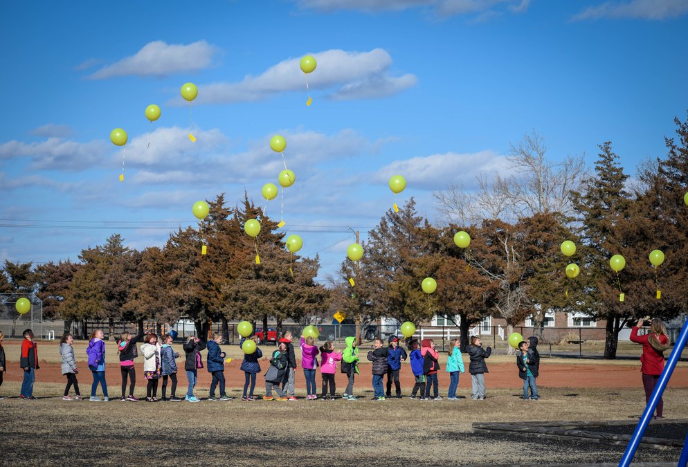 In celebration of Kansas Day, the second-grade students at Lincoln Elementary school released bright yellow balloons into the blue Kansas sky on Jan. 29. In notes attached to each balloon, students shared a Kansas Day greeting as well as their favorite thing to do in Great Bend. The notes also included the school’s address in hopes that, once found, a return note will be sent back to the school.