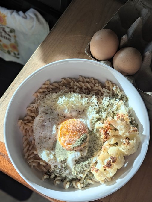 This simple meal is both cheery and way too easy — plus it works great for any meal of the day. Sometimes the simplicity of good pasta adorned in the basic jewels of salt and butter is just the ticket; while the addition of a fried egg might seem incongruous, however, I found the jammy yolk running into the folds of the noodles made the best version of a sauce in that moment. I enjoyed the edges of my bowl where I included a drizzle of pesto and some roasted cauliflower, but realized that was mostly for my reputation, because I just wanted more plain “egg noodles.”