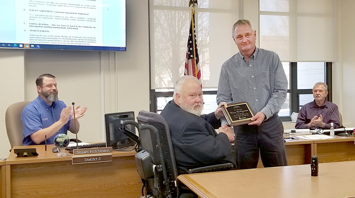 Before offering Barton County Finance/Human Resource Manager Matt Patzner the contract as county operations director, the County Commission took time to honor Barry McManaman who stepped into the breach and took the position as interim county administrator until a permanent county lead administrator was found.