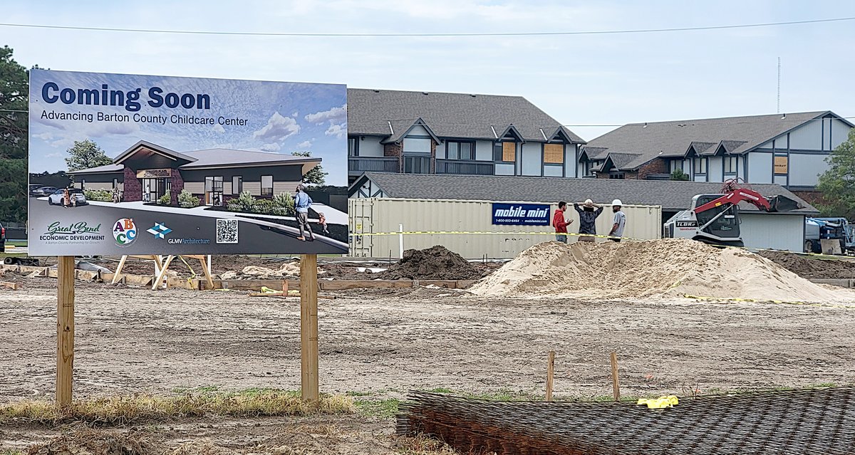 A crew does dirt work at the site of the new Advancing Barton County Childcare Center at Farmers Plaza on the corner of 10th Street and K-96 Thursday afternoon. This is the culmination of a project two years in the making brought about by Great Bend Economic Development Inc. through its subgroup Advancing Barton County Childcare. Ground was broken on July 20 and the plans are to have the construction of the $1.9 million, 6,800 square-foot facility done by next spring.
