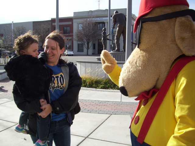 Ali Gonzalez, 2, from Ellinwood, came to Great Bend with her mom, Liz Zoren, to raise funds for the Golden Belt Humane Society. GBHS held its first ever Get off your butt and walk your mutts fund raiser on Saturday. The family has three dogs and one cat, which they have always gotten from the animal shelter. They paused for a moment before beginning the walk to talk to Elk Roy, the Drug Awareness Dog sponsored by the Elks Lodge.