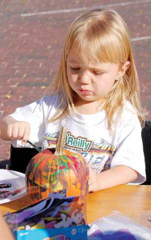 A young girl decorates a small pumpkin at the childrens carnival in Russell Saturday morning. The carnival was part of the first-ever Broncs, Bricks and Barbecue celebration in Russell which featured a whole day of activities. There was a car show, a Kansas City Barbecue Society-sactioned barbecue contest, live music and a sidewalk sale, as well as other events. The ideal fall weather brought a large crowd to take part.