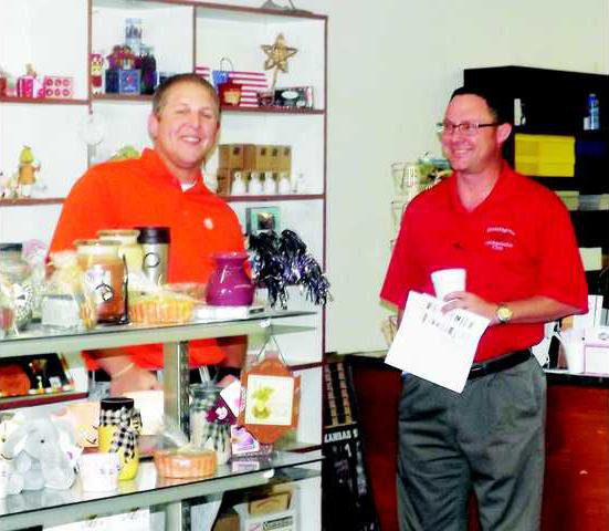 Scott Goodheart, left, bid the Hoisington community farewell as he leaves his job as director of recreation for Pratt. Brian Wilborn, right, read a letter from Mayor Clayton Williamson, saying farewell to Goodheart and thanking him for his service to the community.