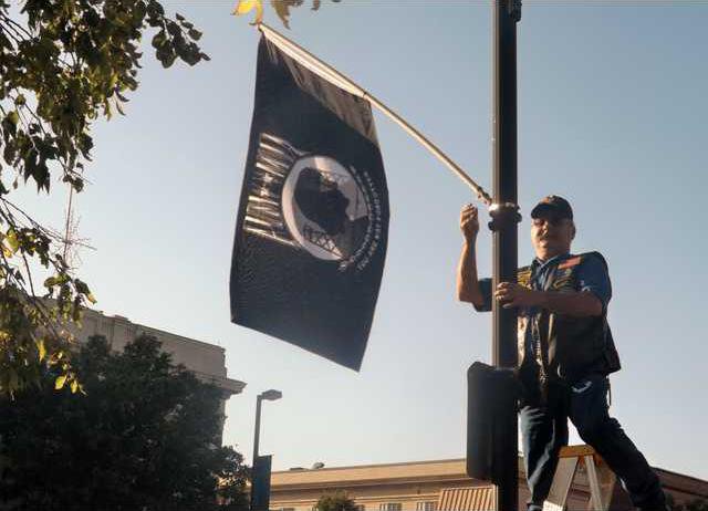 A member of the Great Bend American Legion Post 180 hangs a POW/MIA flag in the courthouse square, Thursday evening. Alternating POW/MIA and American flags were hung for Friday’s observance of National POW/MIA Recognition Day. It is observed across the nation on the third Friday of September each year.