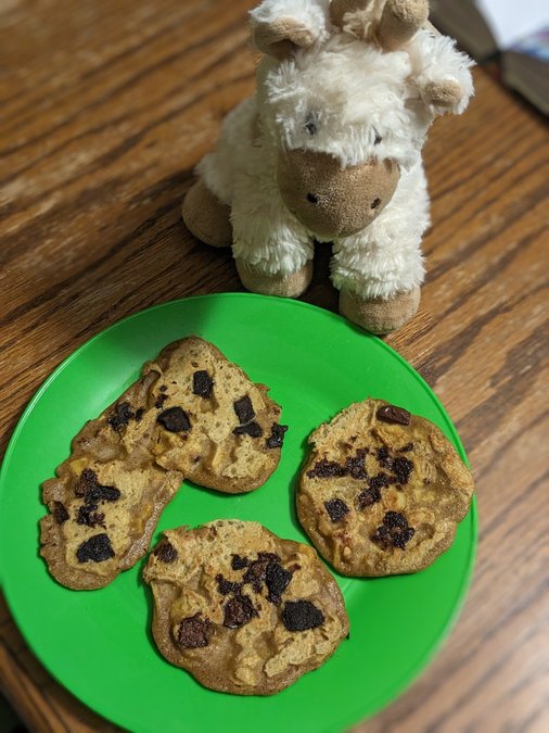 Combine the dry ingredients. In a separate bowl, beat the eggs well, then whisk in the peanut butter and milk; whisk this into the drys. Stir in the apples. Fry in butter in a nonstick skillet, either in rounds or hypothetically the shape of a giraffe head and neck, and before you flip the first time, drop on a few chocolate chunks for giraffe spots.