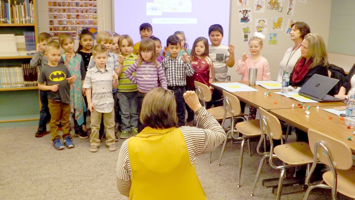 Kindergarten teacher Pam Hagerty said one of her students has a mother who is deaf, which inspired her to have students learn the letters of the alphabet in American Sign Language. She led them as they presented the ABC’s, and when the children paused in their recitation it was only because the teacher had stumbled on a letter. Then they spelled and signed “Eisenhower Eagles.”