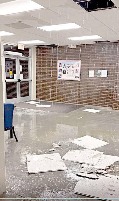 In the Technical Building, a piece of the roof lifted up and broke loose. Ceiling tiles ended up in classrooms and offices, all over the carpet, Dean said.