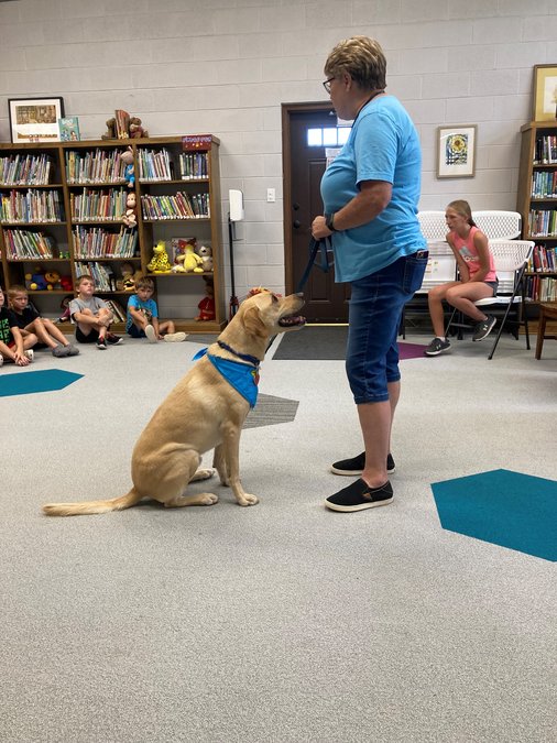 Kim Volker and her lab, Tank, joined us July 2. Kim and Tank demonstrated several good traits for our children, such as patience, obedience and manners. Kim also brushed Tank’s teeth and talked of good hygiene. Tank finished up the morning by letting the kids read to him. Needless to say it was a great morning with lots of kid/dog love. Thank you Kim and Tank for such a fun learning time.