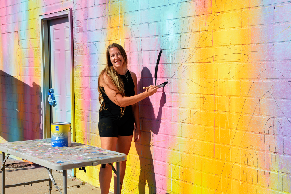 The Barton Arts Movement (BAM) commissioned Hayden for this large-scale project after seeing her on TikTok. Her canvas is approximately 420 square feet of wall. Her specialty is the “color melt” technique she taught herself more than a decade ago.