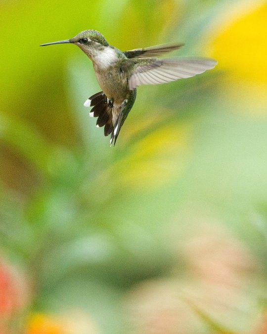 In Kansas, 10 species of hummingbirds have been recorded; however, four of those species are considered common, and one, the Ruby-throated hummingbird is by far the most common species seen throughout the state. Ruby-throated hummingbirds breed in the eastern third of Kansas, and can be found throughout the summer in the western part of the state. They are migratory, however, and August and September seem to provide the most observations throughout Kansas, with adult males coming through first, with adult females and juveniles lingering longer into fall. Moreover, late September is often the time of year to see other rare species of hummingbirds in Kansas. Ruby-throated hummingbirds mostly winter in Mexico and Central America, and many are known to make the treacherous 600 mile journey across the Gulf of Mexico during their migration.