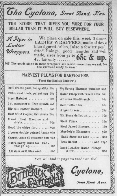 That’s just about $5.60 a week for women, and $9.84 a week for men. That’s about a 70 percent wage gap. Another consideration is how far the wage went at the time. A ready to wear dress or “wrapper” was advertised by The Cyclone dry goods store for 65 cents. At C. Samuels New York Store, it cost between 75 cents and $1 to buy a new shirtwaist, and skirts ranged from 65 cents to $1.45. Fabric for the home sewer cost 4 cents a yard for lawn, and 10 cents a yard for denim. For a Montgomery Wards catalog, the cost was 15 cents. And a six-month subscription to The Democrat cost 50 cents. It cost $1.54 to take a train excursion to Hutchinson on the Santa Fe Railroad, and it cost $28.64 to travel to Detroit, Mich.