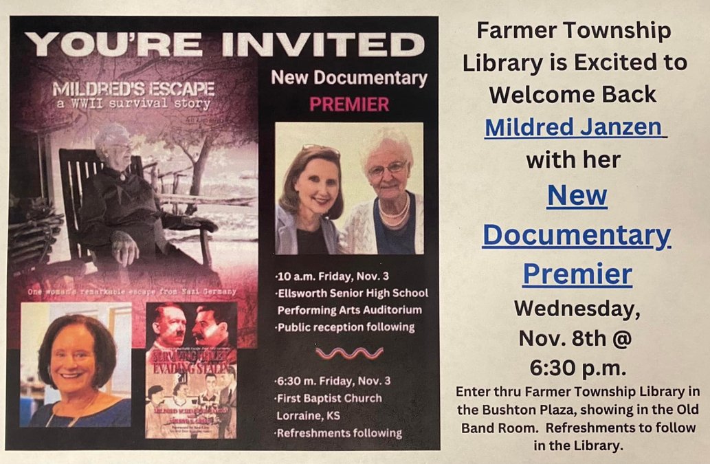 The public is invited to the premiers of a new documentary based on the 2021 World War II memoir of Great Bend native Mildred Schindler Janzen. The film, “Mildred’s Escape: A WW II Survival Story” follows her book “Surviving Hitler, Evading Stalin - One Woman’s Remarkable Escape from Nazi Germany,” said Becky Wasson, a Claflin resident and director of the Farmer Township Library in Bushton, the site for one of the viewings.