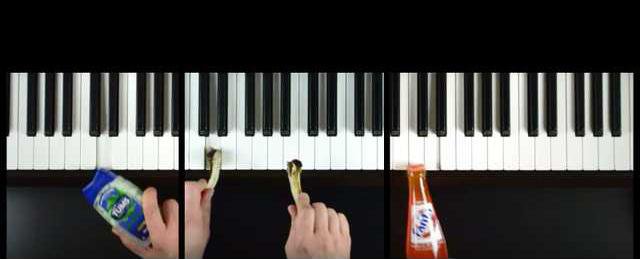 He plays the Meow Mix jingle with a can of cat food, McDonald's with a fry box, Huggies with a diaper and Oscar Mayer with a hot dog. It's well worth 2.5 minutes of your time.