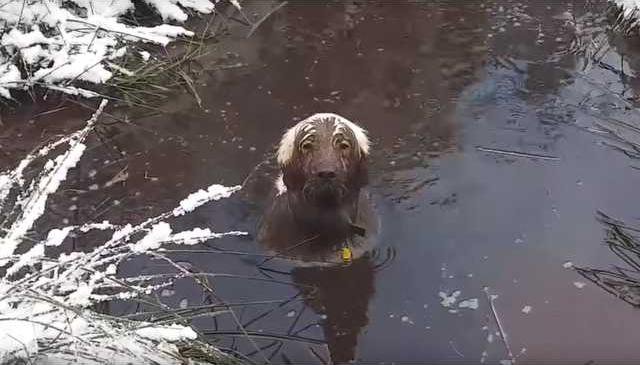 Despite pleas from the woman in the video, Toby goes in and out of the mud puddle, eventually covering his whole furry being in squelchy mud. Occasionally he lifts up his head and flashes his puppy dog eyes, probably fully expecting to be forgiven of all his mud misdeeds.