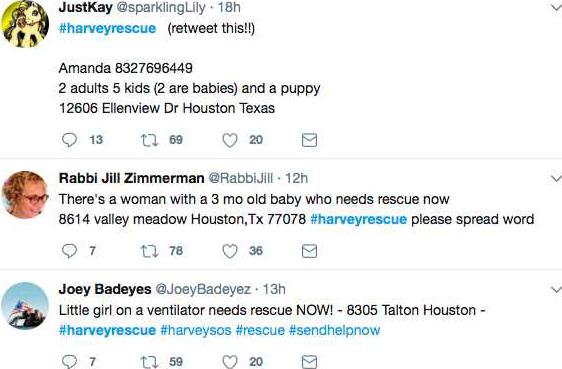 One rescue request was for a woman with a 3-month-old baby, and another for a little girl on a ventilator. Some people tweeting for help seemed like they were using social media as the last resort for rescue for their loved ones. People also used normal means to call for help, of course, and we know through all of these efforts, rescuers saved thousands of people from the rising waters.