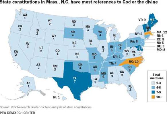 The map with the report shows that each states constitution includes at least one reference to God or the divine.