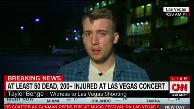 During CNNs New Day program, Taylor Benge recounted his survival story at Sunday nights shooting, which killed 59 people and left more than 500 people injured.