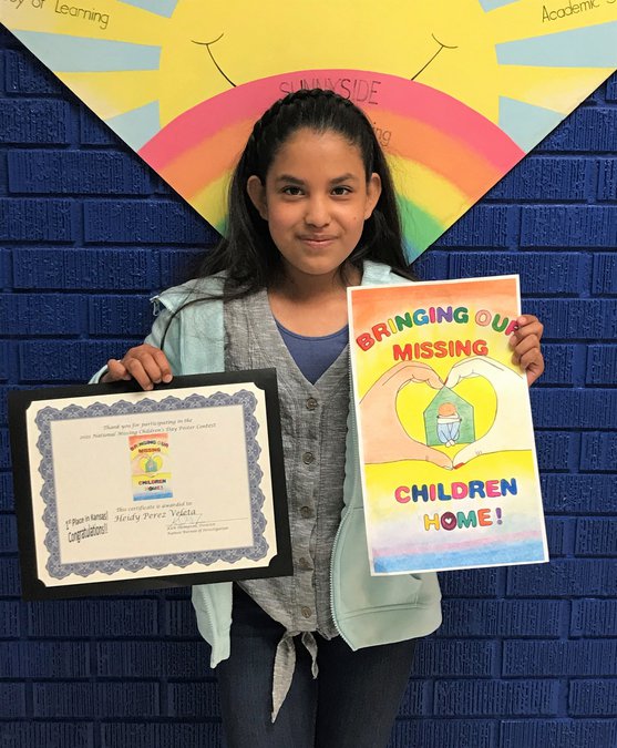 Kansas Attorney General Derek Schmidt represents the National Association of Attorneys General as a member of NCMEC’s Law Enforcement Advisory Council. Schmidt, along with KBI Director Kirk Thompson, recently announced the winner of the 2021 National Missing Children’s Day Poster Contest: Heidy Perez Veleta, a fifth-grade student at Sunnyside Elementary in Dodge City. Miss Veleta was previously announced the state winner, which qualified her for the national competition.